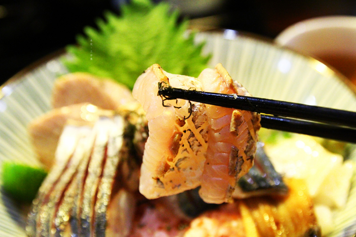 炙燒海鮮丼,整個超豐盛的,數一數約有5種起跳的海鮮,每個幾乎是兩塊,紫蘇葉當分隔線後方是一些小配菜,讓整體不會太單調