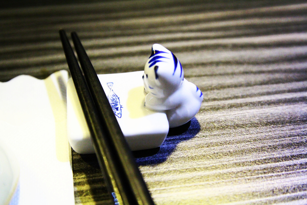 桌上餐具很符合店名,筷架是一隻貓咪盯著一條魚,好可愛 >///<
