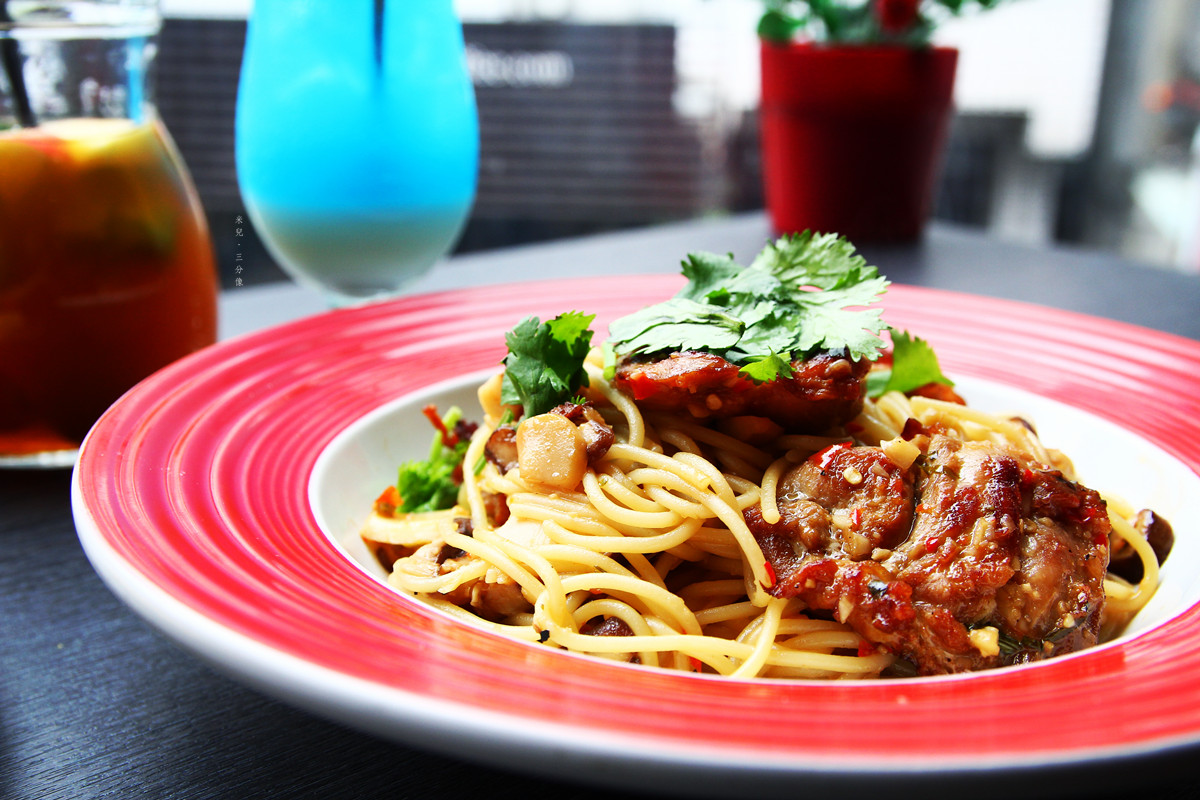 泰式椒麻雞義大利麵,這道是人人稱讚的一道,味道酸辣,且雞肉也醃的很香,麵條的軟硬適中,雖然它很辣,但讓人欲罷不能!這是米兒最推薦的一道義大利麵(辣)!