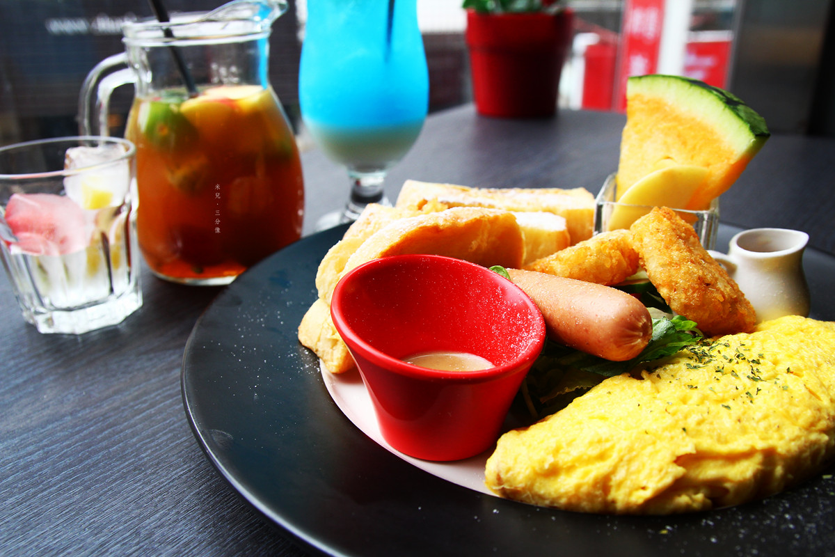 巴黎的早餐,相信外國人一定都這樣吃,簡簡單單的,但又很豐富,裡面有法式吐司、生菜沙拉、歐姆蛋、德式香腸、薯餅以及水果,非常多樣化的組合,但都很搭,吃完一盤真的很飽