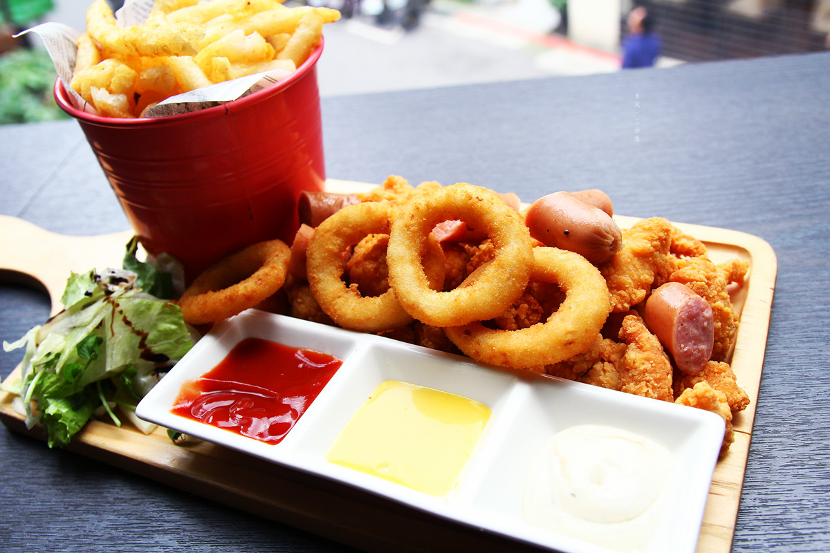 澎派嘉年華大拼盤,裡面總共有四種分別是脆薯、洋蔥圈、雞米花和德式香腸,他還有放生菜一起搭配,另外還提供了3種沾醬番茄醬、黃芥末醬、塔塔醬,3種醬都很好吃,就依個人喜好沾囉!!