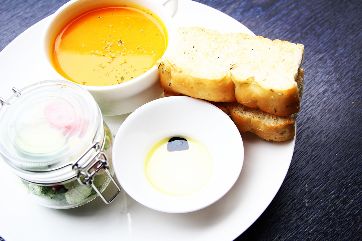 這是點餐搭配套餐的內容,會有罐子沙拉、一碗南瓜濃湯和兩塊香料麵包沾油醋醬,整體表現得還不錯