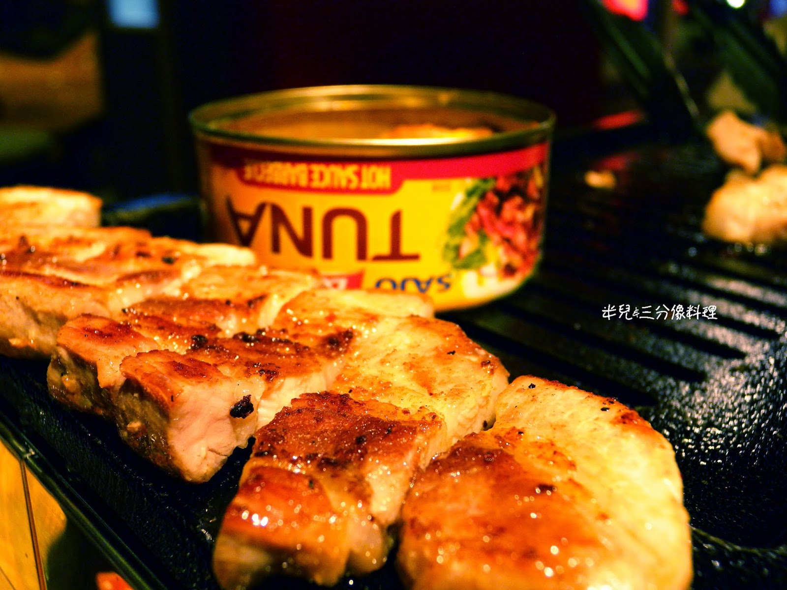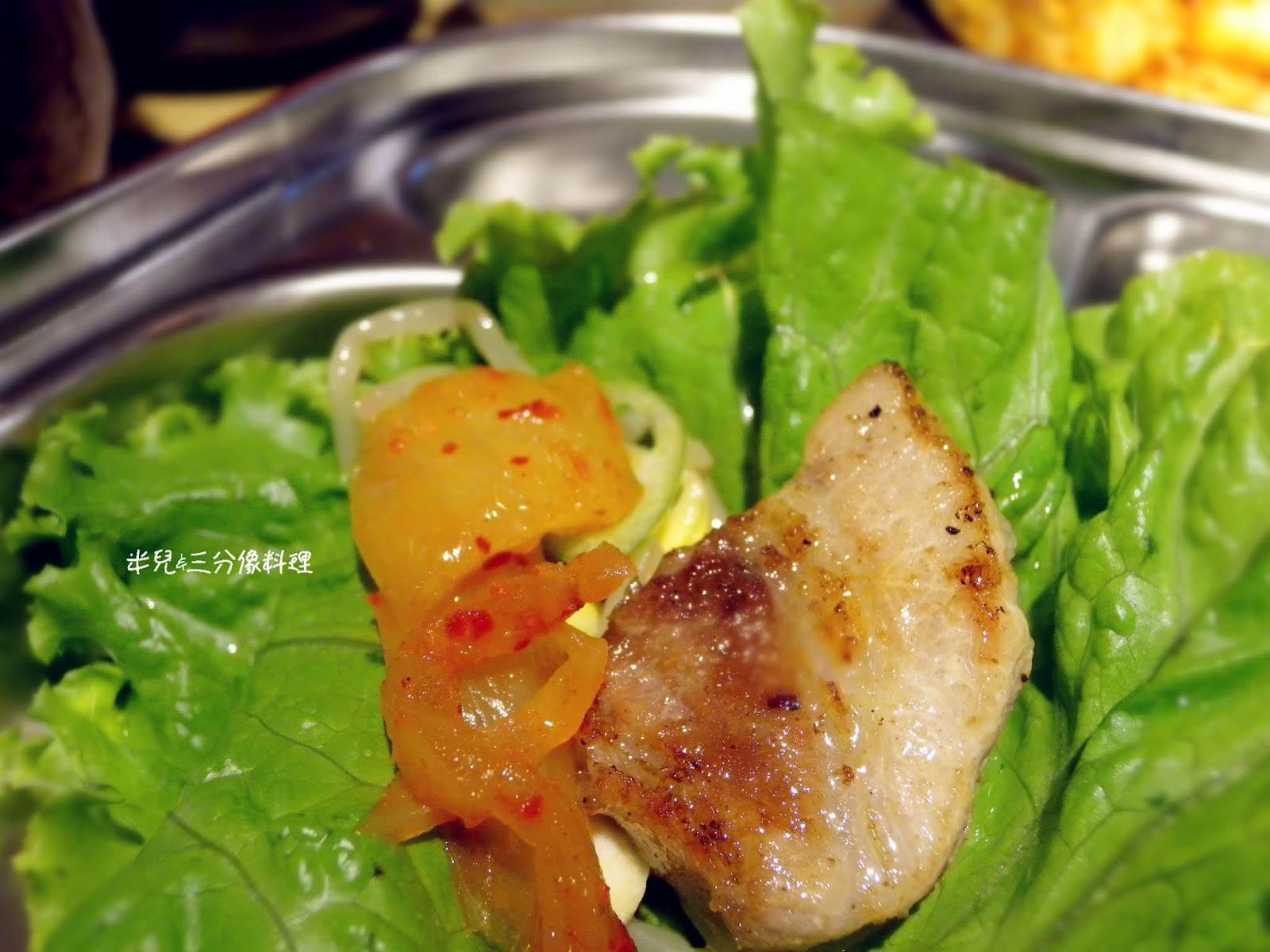 生菜裡放泡菜 豆芽 辣椒 蒜片 味噌 一塊厚切豬五花