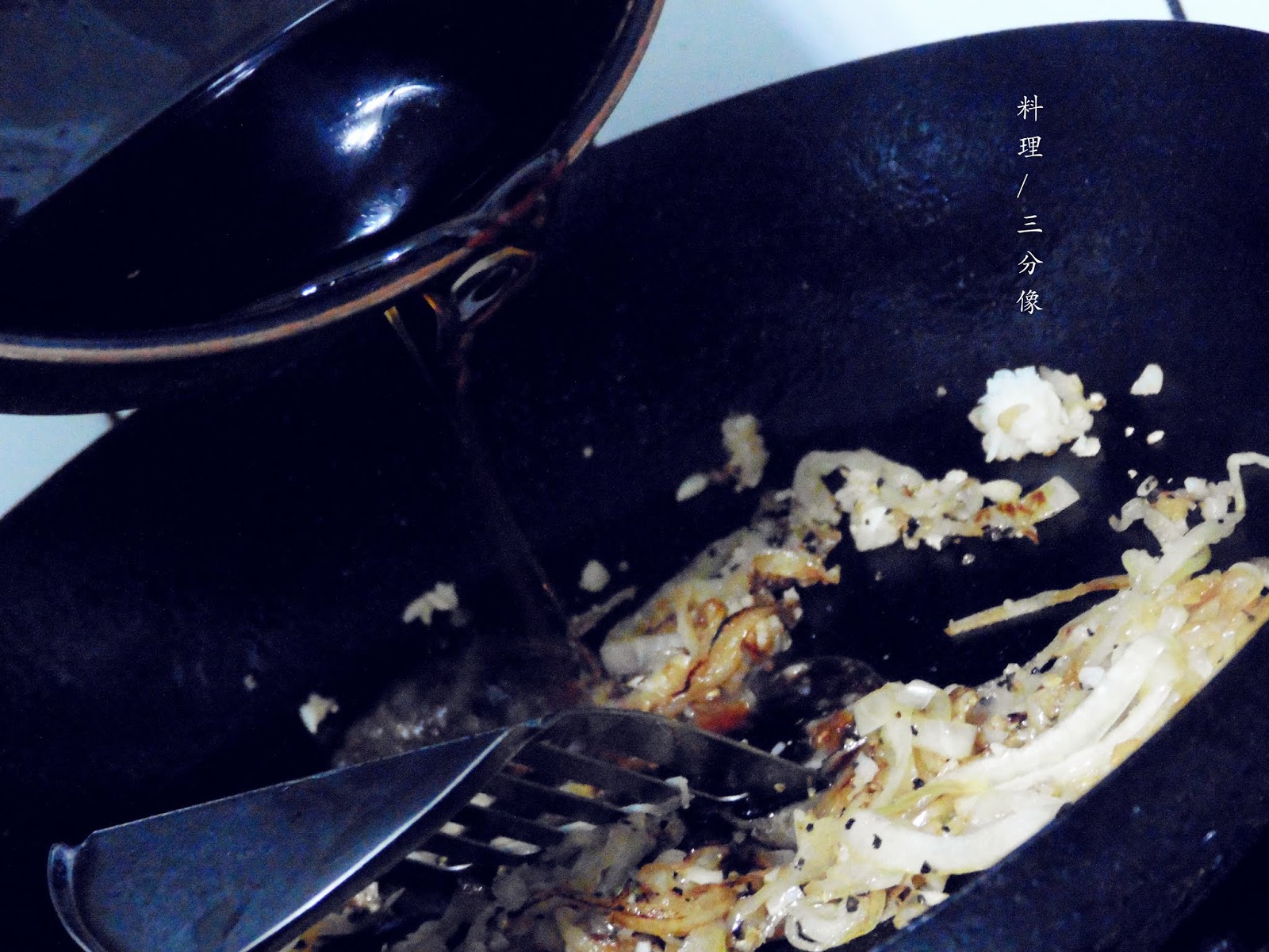 洋蔥開始有焦糖色出來後放入蒜碎繼續炒
