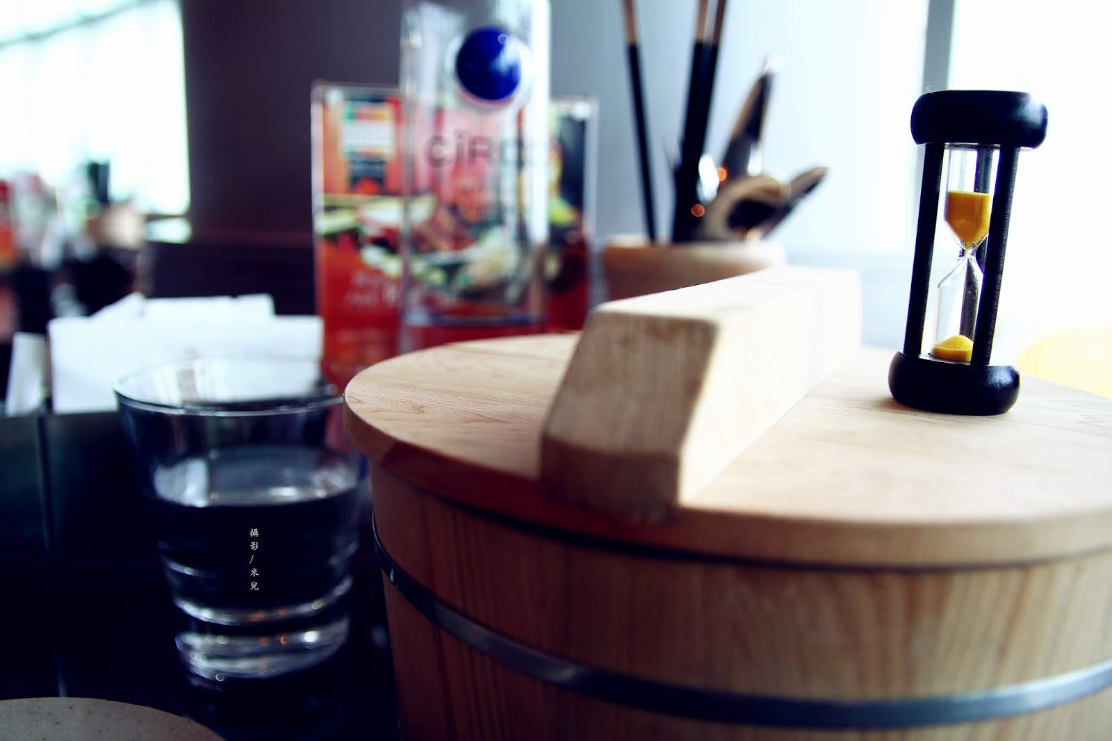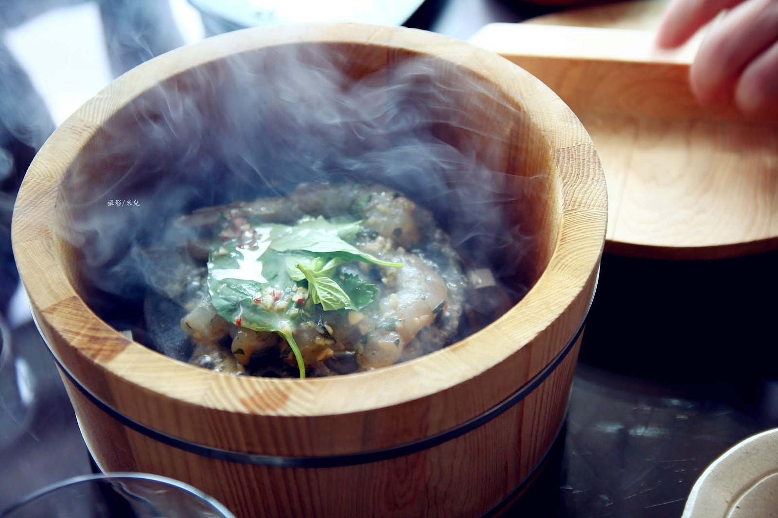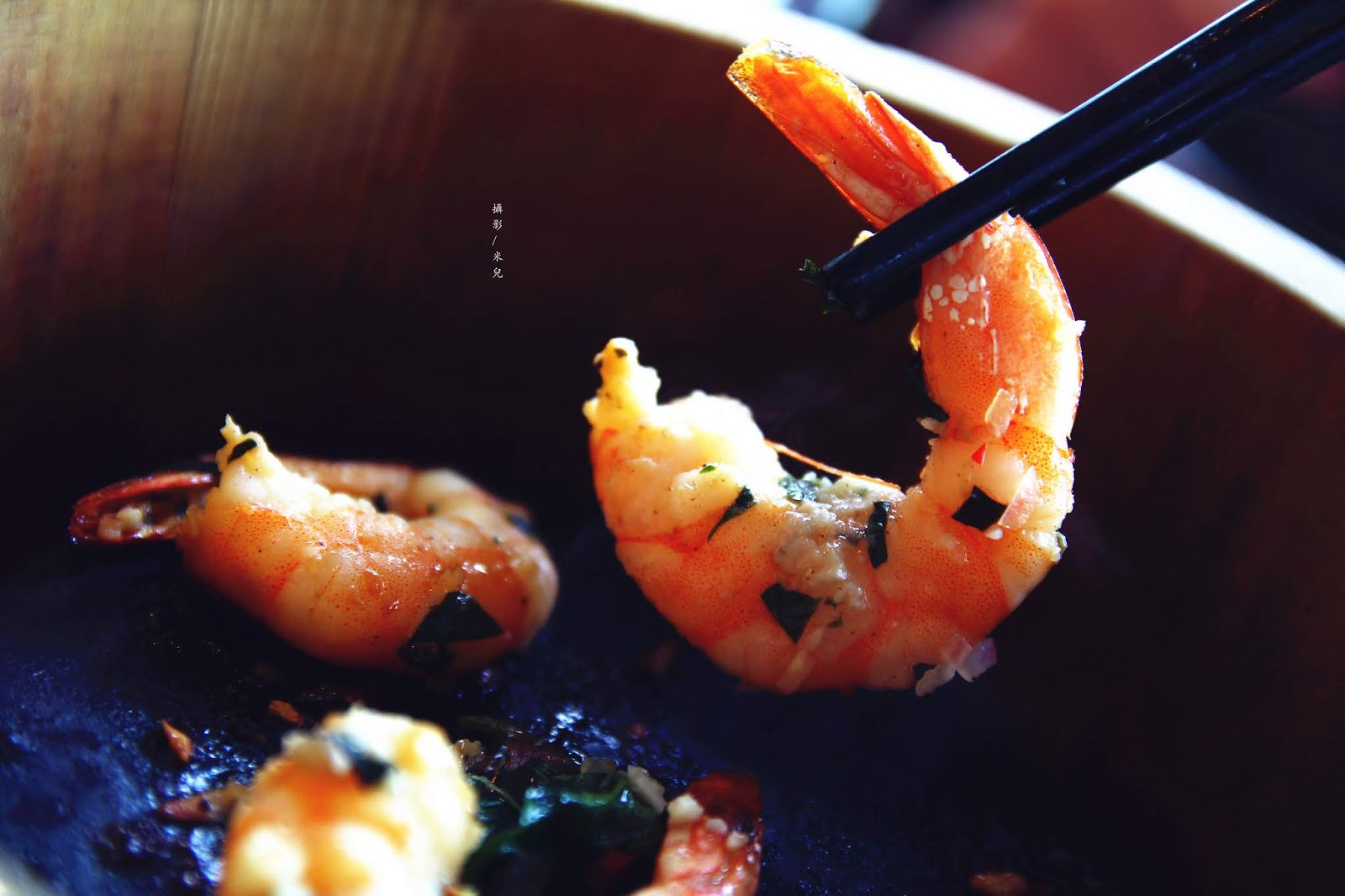 他是 蝦子一盤 一個木桶鍋 然後九層塔 還有一杯酒
