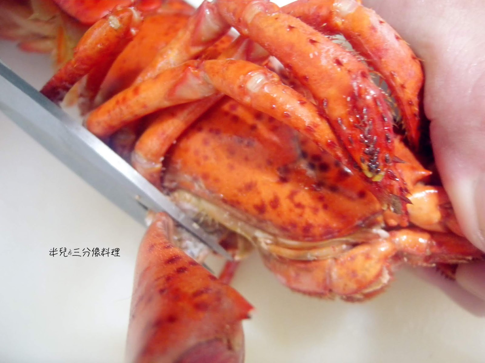 先拿剪刀 將龍蝦的螯與身體連接觸剪開