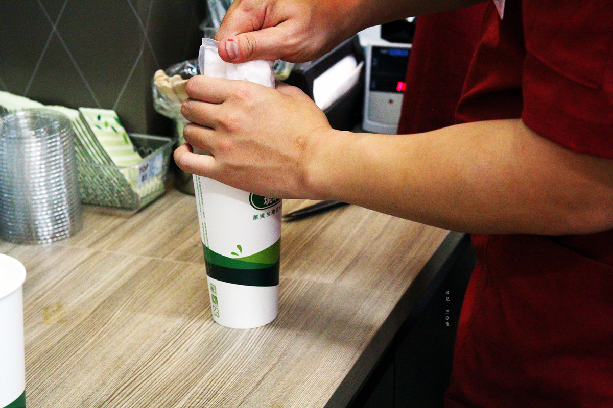 大約10分鐘後珍珠奶綠就弄好了,我覺得要挑戰1分半有些難,因為他們的珍珠好像是要泡開的那種需要點時間,不過我還是很興奮的跟他們說了3次謝謝XDD包裝上沒甚麼特殊,他的蓋子是一般的手動蓋上,不是自動封口膜,感覺離手搖杯還是有些距離