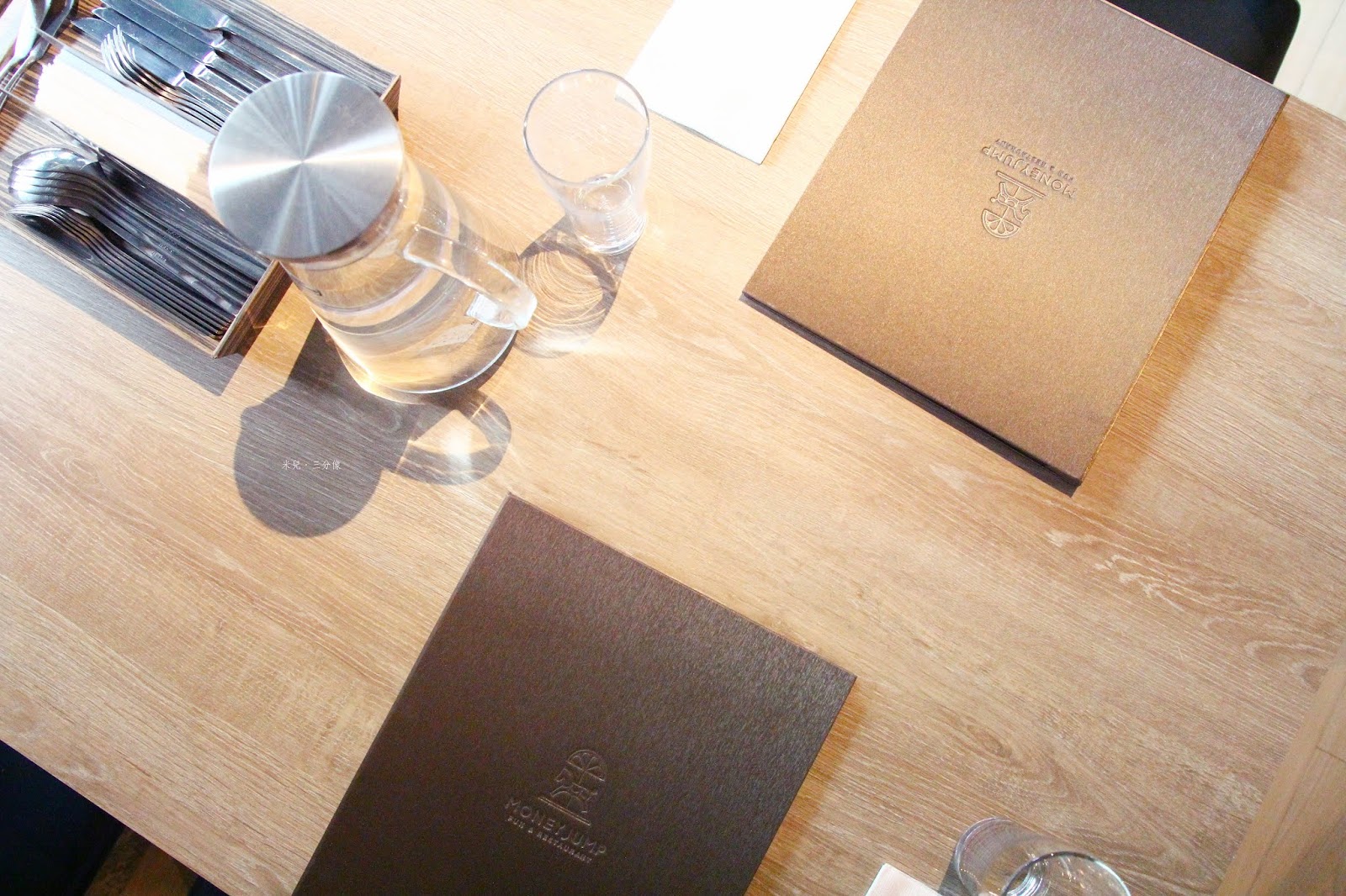 桌上擺放水杯及一湖水還有餐具跟菜單,都很乾淨整齊,顏色搭配感覺很舒服,居家感