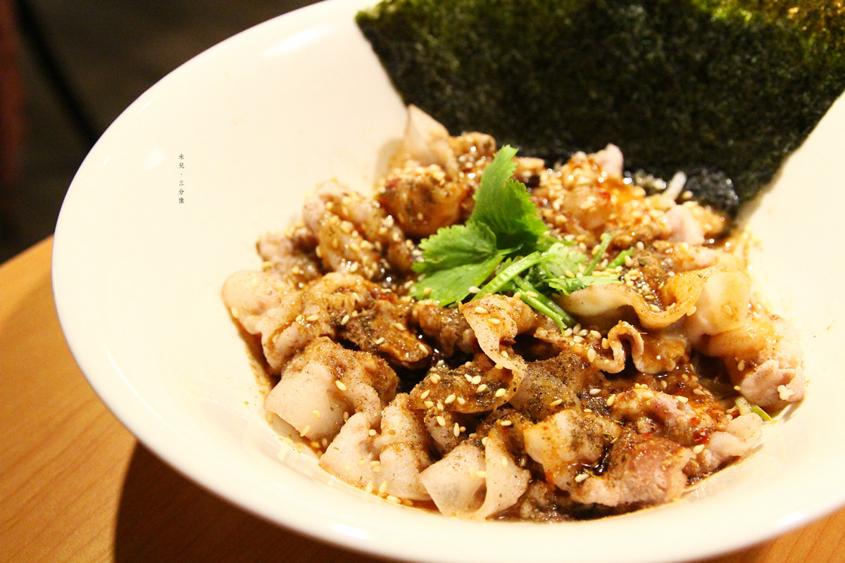就是豬肉扮入川西口味的調味料,吃起來香麻微辣,很涮嘴,包海苔吃米兒覺得味道很好,這道蠻喜歡的三兩下就解決,肉的部分也度乾柴,我想是因為油脂夠豐富,但不油膩表現得很好