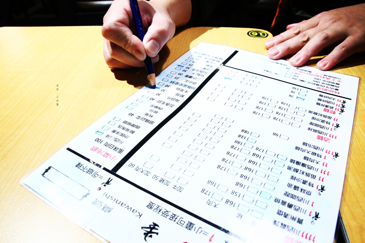一進到店哩,服務生會給你帶位然後給你菜單及點菜單,會先跟你介紹推薦菜色,然後在自己畫單,話單好就到櫃檯點餐囉!