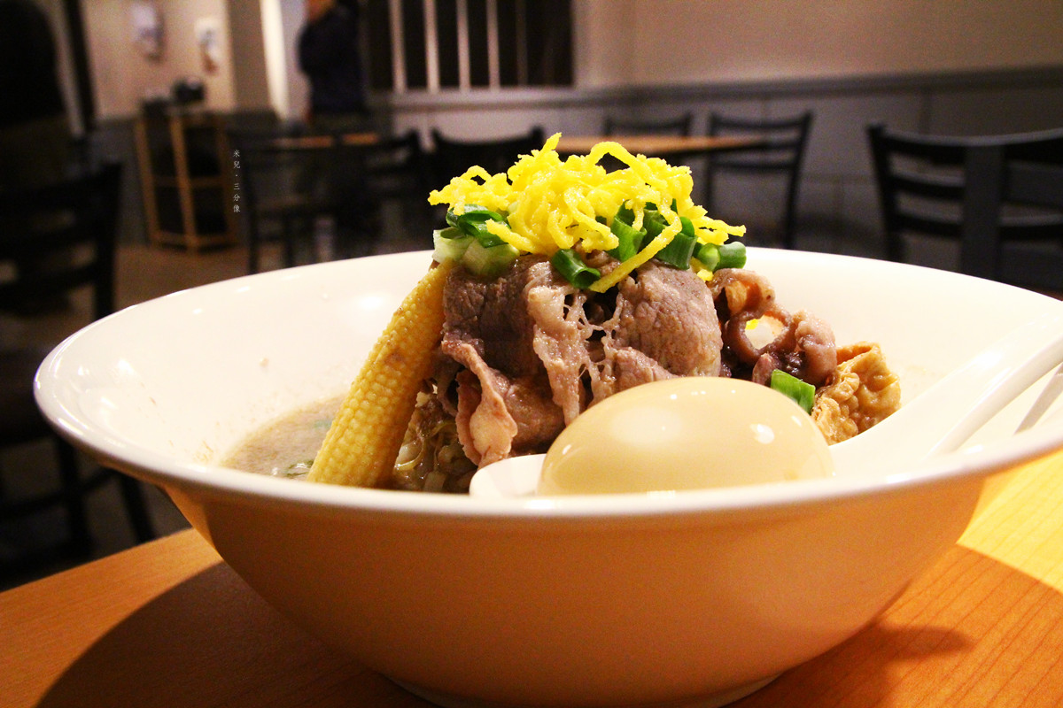 味道就ˋ濃郁的牛肉香,屬於清淡型的,牛肉採用肉片呈現,裡面有豆芽菜、豆皮、蛋絲、青蔥、玉米筍以及糖心蛋,糖心蛋的溫度控制得很好,整體上還不錯吃