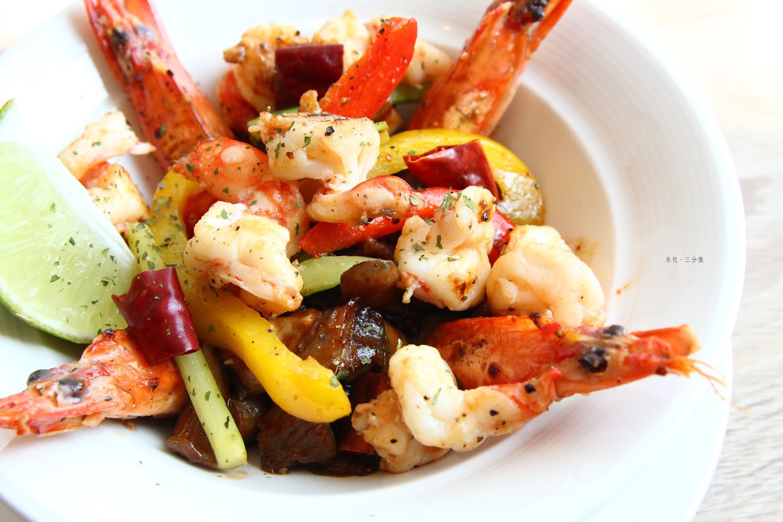 裡面有香菇 紅黃甜椒 芹菜 主角蝦子